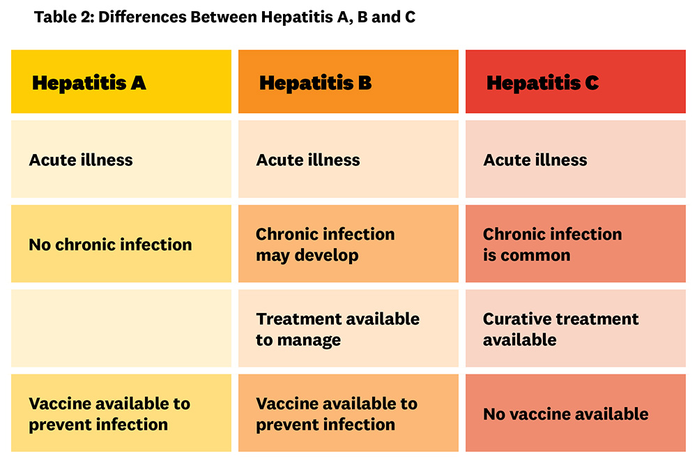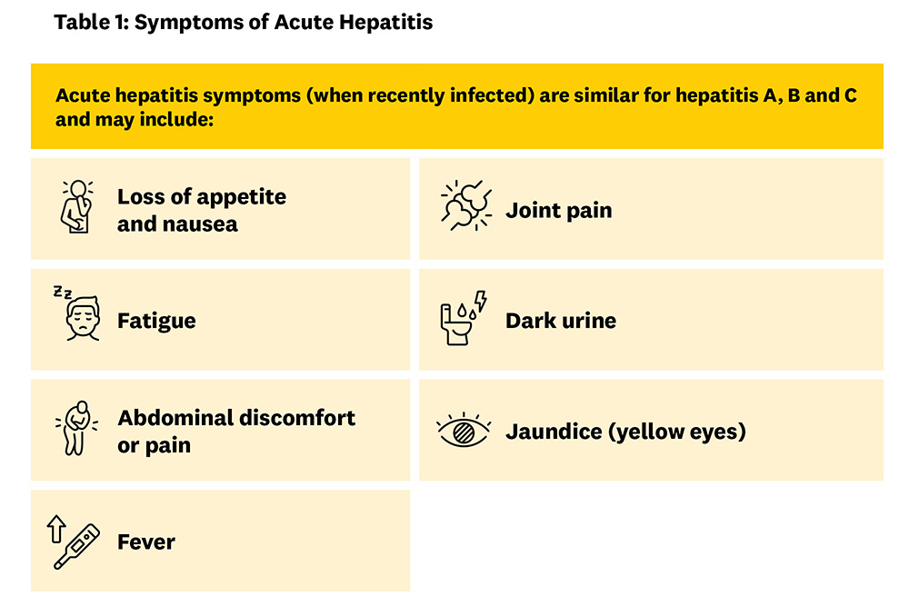 Like hepatitis B, hepatitis C can present as an acute illness with fatigue, loss of appetite, nausea, abdominal discomfort and jaundice. (See Table 1 for a list of possible acute hepatitis symptoms.) Importantly, many who develop an acute illness will go on to have a chronic infection and be at risk of liver complications in the future.
