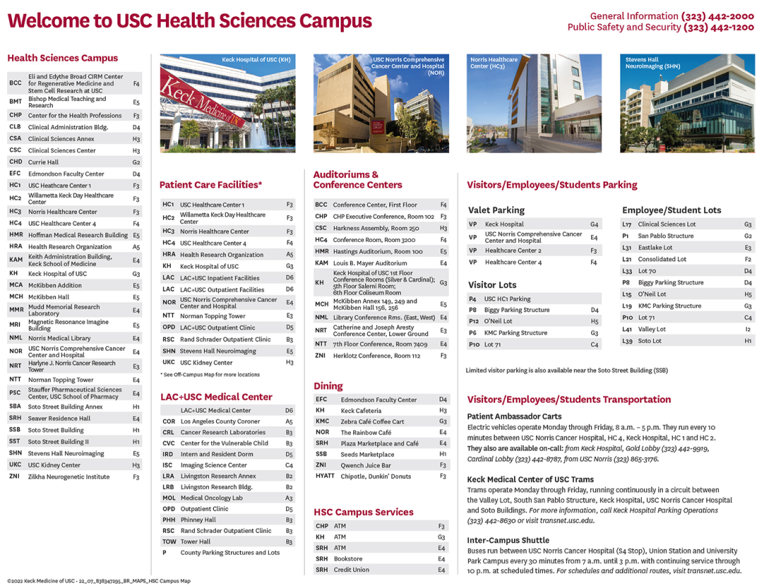 Click on the image below to download the most recent version of the health sciences campus map. Maps are available for individual ambulatory locations upon request by emailing identity@med.usc.edu.