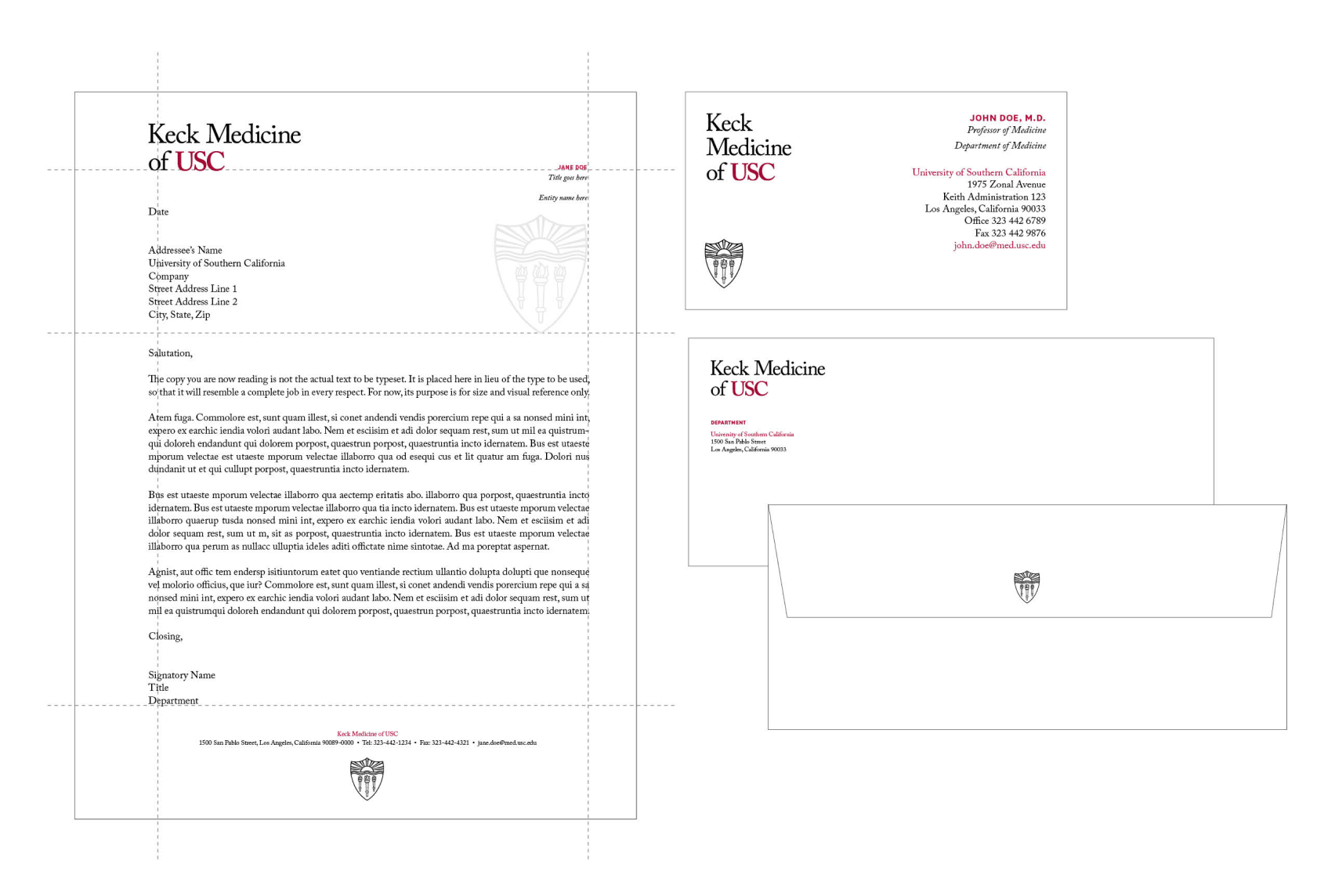 The approved Keck Medicine of USC stationery system is aligned with the university’s official stationery and mirrors the university’s design with the inclusion of the shield as a graphic element while featuring our health system logotypes. The stationery system consists of approved designs for letterhead, envelopes and business cards which reinforce the brand and identity of the health enterprise.